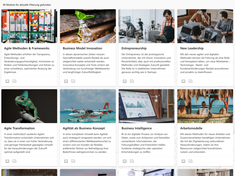 Aktuell 38 Kompetenz-Module, die didaktisch und inhaltlich erfolgsgeprüft sind. Aus diesen Modulen werden die persönlich individuellen Entwicklungsprogramme zusammengestellt.
