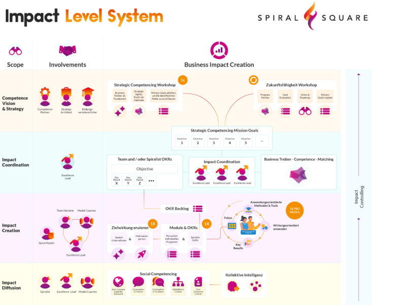 Mit der Individualisierung entstehen natürlich auch neue Herausforderungen. Anstelle von Dozenten, die eine ganze Gruppe unterrichten, gibt es bei Spiral Square persönliche Coaches für das Gesamtprogramm sowie Fach-Coaches für jedes einzelne Modul. In der Impact Journey werden die Kompetenzen von Personen ausgebaut – anwendungs- und wirkungsorientiert. Um die individuelle Kompetenzentwicklung dann auch auf die auf Unternehmensziele auszurichten und zu koordinieren, gibt es das Impact Level System.