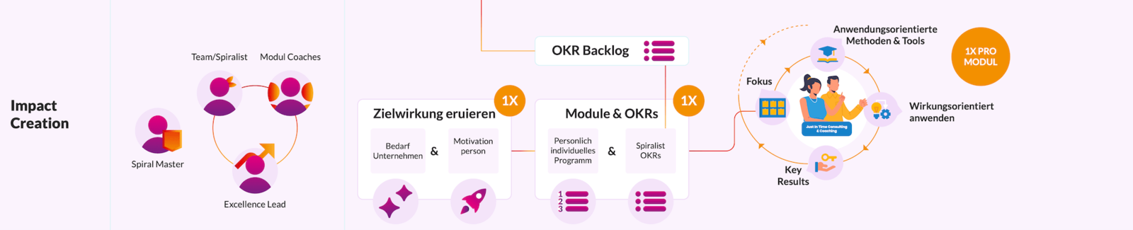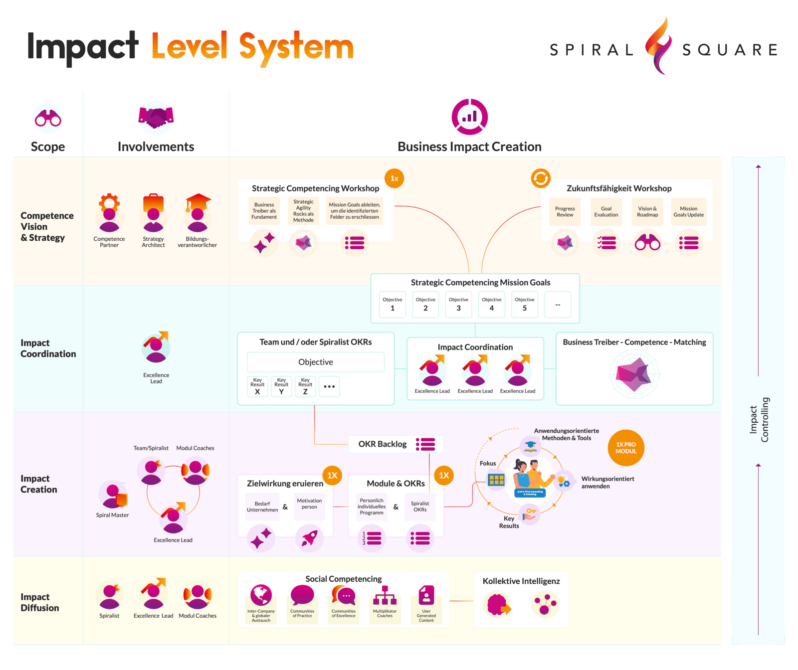 Die Wirkung wird durch die Spiralists in ihrer individuellen Impact Journey erzeugt, indem das Wissen zum Zeitpunkt der Herausforderung (just-in-time) aufgebaut und mithilfe der mitgelieferten Tools (just-in-scope) angewendet werden. Neue Kompetenzen werden direkt gewinnbringend eingesetzt. Erfolgsgesichert durch Modul Coaches, die für das jeweiligen Gebiet speziell ausgewählt worden sind und ohne Umweg in der Spiral Square App angesprochen werden können (just-for-you).