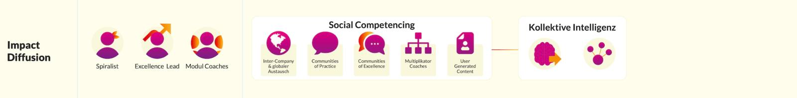 Reflektiertes Anwendungswissen sowie "User-Generated Content" können sich so innerhalb des Unternehmens entfalten und neue Impulse setzen. Vorangetrieben durch motivierte Personen, unterstützt durch aktuelle Inputs der Modul Coaches, moderiert durch Spiral Masters.