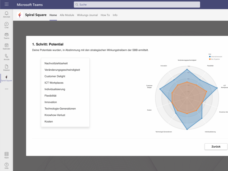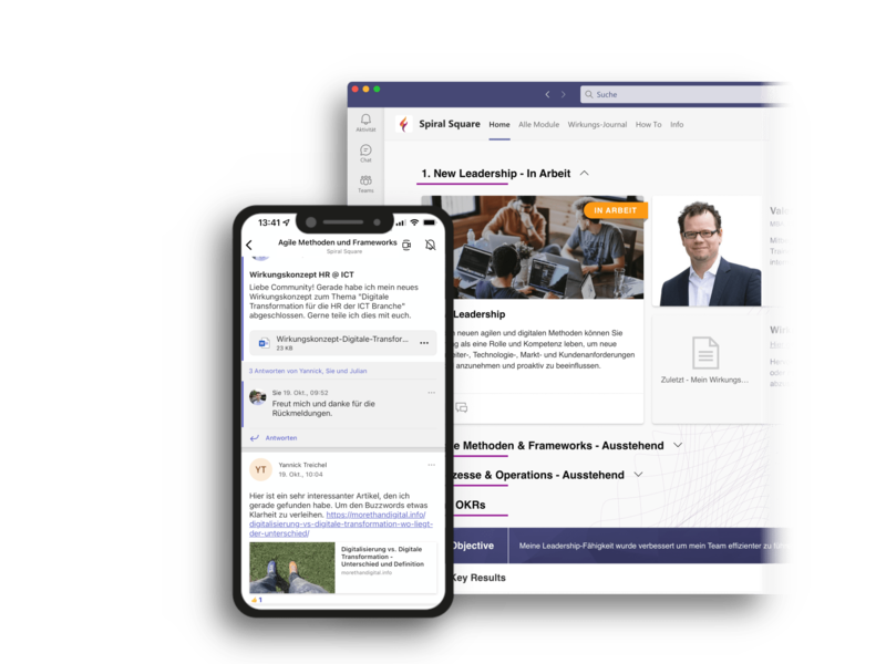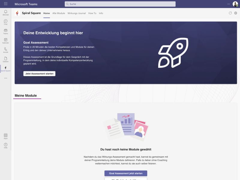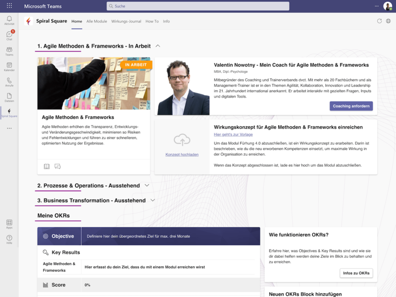 Spiral Square ist als Microsoft Teams App einfach zu verwenden und nimmt allen, die ihre Performance mit Spiral Square weiter entwickeln, viel Aufwand ab. Sei es, die eigenen Ziele im Blick zu haben, das persönlich individuelle Programm zusammen zu stellen, Modul-Coaches anzufordern und Video-Calls durchzuführen oder sich in den Communities of Practice auszutauschen. Alles ist nur 1 Klick entfernt.