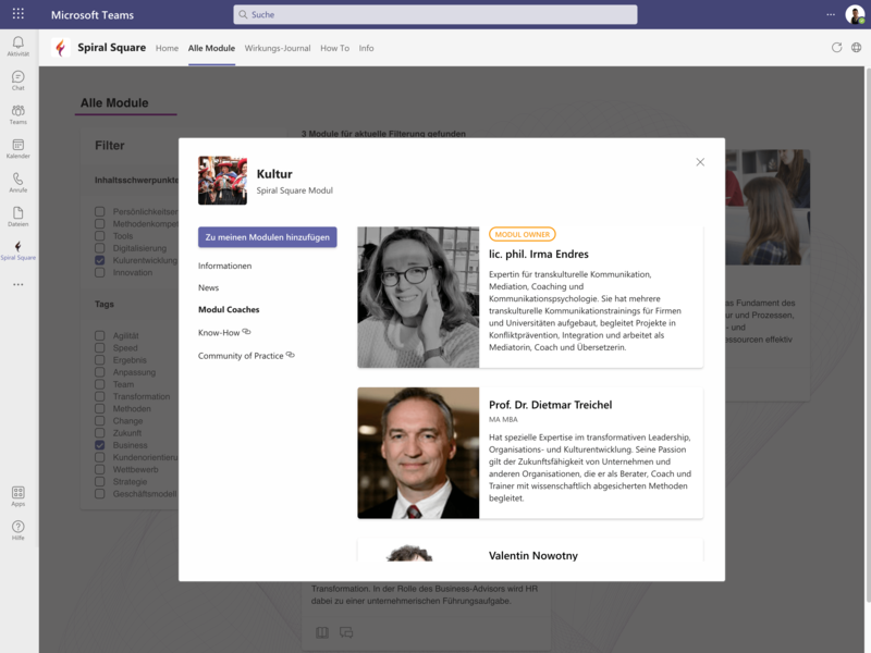 Damit Kompetenzentwicklung direkt in der Praxis wirkt, bietet die Spiral Square App direkte Links zu Fach-Coaches, die den Teilnehmenden zu maximalem Erfolg verhelfen. Sie coachen gezielt in den Modulen und stehen mit ihren praktischen Erfahrungen ad-hoc für methodische Fragen und fachlichen Input persönlich zur Verfügung.